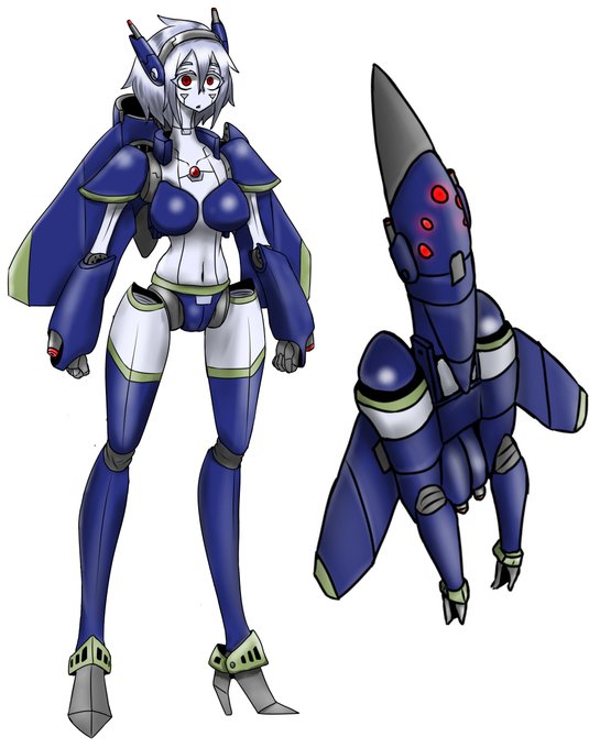 #貴方の敵役機体を見せて下さい #絵描きさんと繋がりたい 可変式重戦闘機ロボ娘、ネオン 上のプロトタイプ、ノワールウィンド 1キロの巨大変形要塞ロボ、マガツノスメラ カジキに変形する、キジカログマ(名前の元ネタあり)