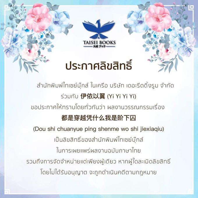 สนพ. Taisei books ประกาศ LC #นิยายวายแปลจีน