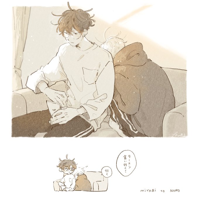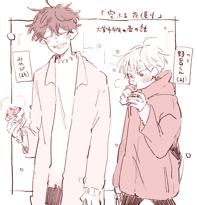 カレンダー、4月よろしくおねがいします🌸『空ふる花便り』より、みやびと野呂くんです。目を惹くものがあるとよくじっと見る野呂くんなのですが、気を遣わなくていいみやびの前でだからこその行動だろうなと。この絵を描いているとき、もしかしたらみやびは野呂くんの瞳が好きなのかなと思いました。 https://t.co/EmOZDcBr5m