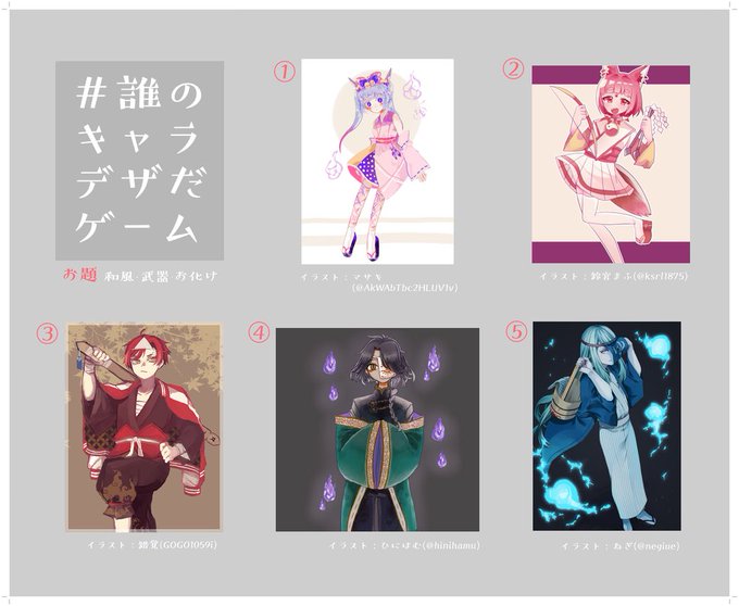 錯覚さん主催の誰のキャラデザだゲームに参加させてもらいました〜! 私は②のイラストを担当しました リプライにてアンケート繋げますので、私のデザインしたキャラクターが何番か当ててください! #誰のキャラデザだゲーム