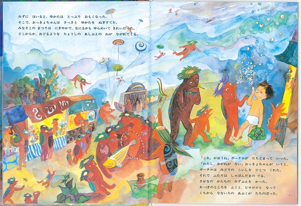 おっきょちゃんは、かっぱの国のお祭りに行きます。お祭りで買う、なな色のあぶくがでる、魚の形のみずぶえが心惹かれます。かっぱの国で暮らす内に何もかも忘れてしまいます…
