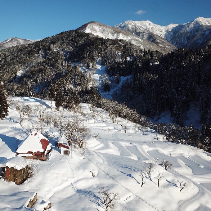 #茅葺き缶詰 長野県小谷村。棚田と茅葺き民家。 雪に覆われた田で春には田植えが行われ、トタンに覆われた古民家では日々の暮らしが行われて、そんな日々の営みが重ねられてきた風景。