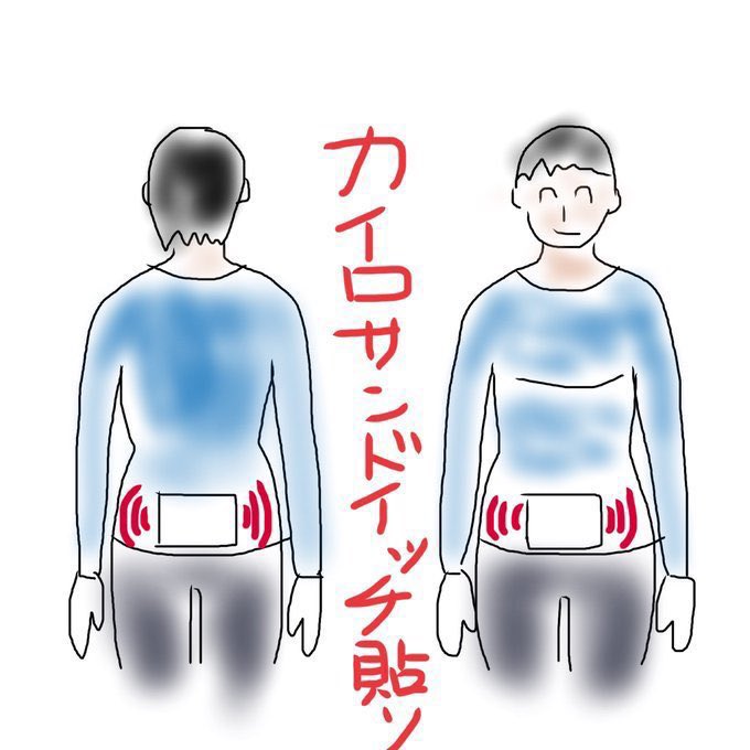ヘソから下の下腹部のツボの関元、気海あたりをカイロで温めます。同時に仙骨との上あたりの腰にもカイロを貼ります。