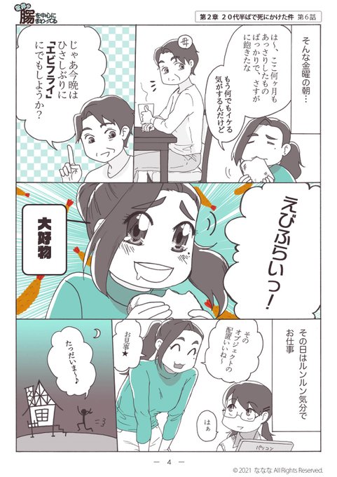 【UC闘病マンガ「世界は腸を中心にまわってる」最新話更新♪】寛解導入に成功した ななな だったが、大好物🍤によってとんでもない惨劇に…!
