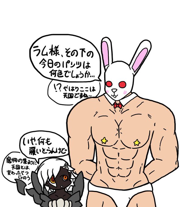 ラムとプロテインさん。その下に何も身につけてなくても死神だから仕方ない...。デビルトピア団、人間にとっては脅威だけど魔物になったプロテインさんにとっては天国...?普段から普通に仲良さそうな2人です。