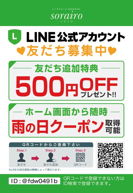 雨割り利用出来ますのでソライロの公式LINEをチェックしてみてくださいね。