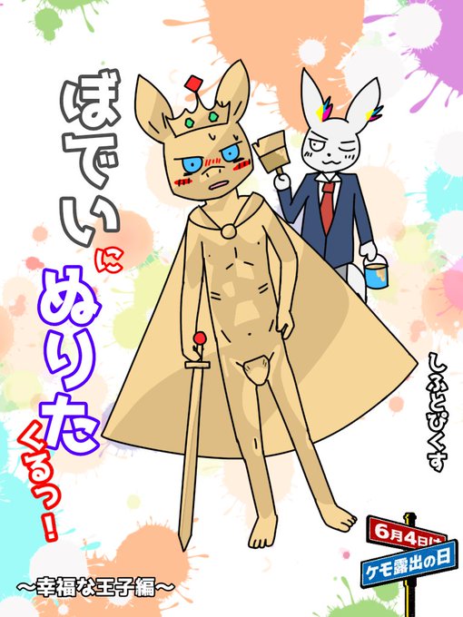 【#ケモ露出の日】 文化祭で銅像役をすることになった陰キャヘアレスドッグ獣人の布袋一平(ほてい いっぺい)が 芸術系ウサギ獣人の塗田九郎(ぬりた くろう)に全身塗られて 色々と目覚めてしまった....お話 ラノベ表紙風イラストです 「演劇での合法露出」をテーマに描きました #ケモ露出の日2021