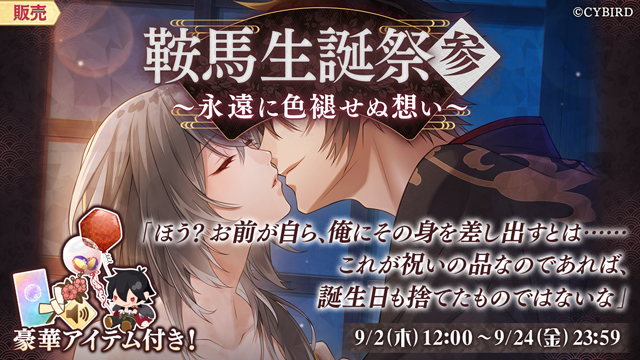 9月2日から鞍馬(CV:森川智之)の【恋仲になってから、初めて迎えた誕生日】をお祝いした 鞍馬生誕祭 ・参「スチル付きストーリー販売」が開始!