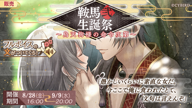 8月28日から鞍馬(CV:森川智之)の誕生日をお祝いして「鞍馬生誕祭・弐カードがちゃ」と「スチル付きストーリー販売」がスタート!