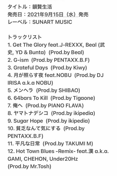 GADORO、5thフルアルバム『韻贅生活』9月15日発売決定。惜しみなく「韻」を追及し贅沢に踏み倒した1枚。収録曲「Grateful Days」配信開始&MV公開 - https://t.co/jpMEjGLDPX…