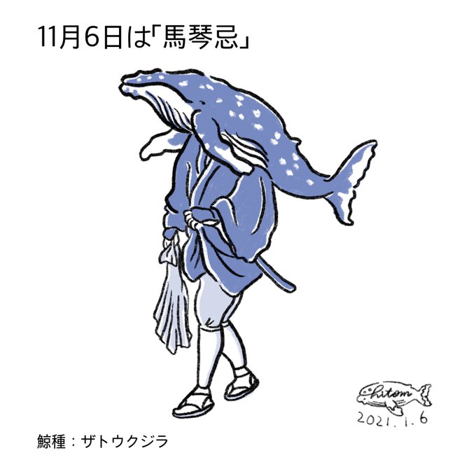 11月6日は馬琴忌。江戸時代に活躍した滝沢馬琴の忌日。馬琴の作品に「鯨魚尺品革羽織」と言うのがあり、りやう四郎と言う鯨取りに父親を捕鯨された鯨の息子が竜宮の大龍王へ敵討ちの願いをするのですが、人間に化けるかと思いきや頭がクジラと敵討ちに行くにはかなり目立つ格好に。かなりツボです^_^
