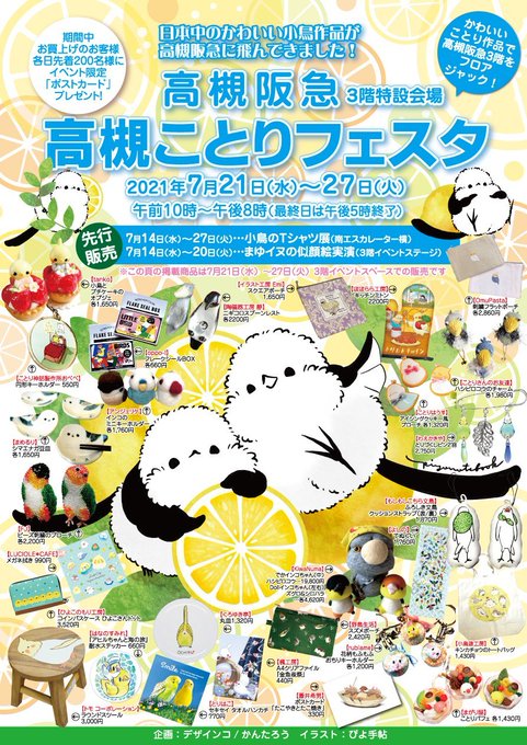 高槻阪急「#高槻ことりフェスタ」先行販売として7/14~20は3Fロフト前、21~27は合流してことりフェスタ会場で出展を実施します。同期間に小鳥のTシャツ展が開催されます。それぞれの期間別に作品ラインナップを変更し販売予定です。是非どちらの期間もお越しいただけますと幸いです! #ことりフェスタ