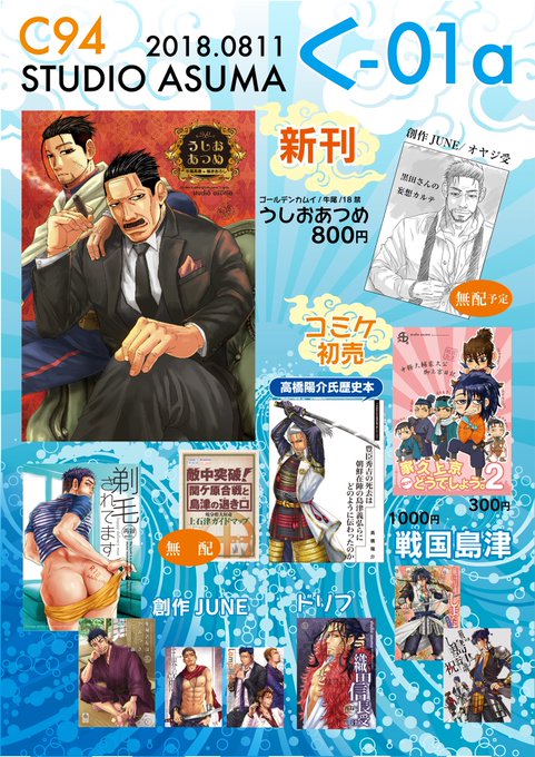 本日、夏コミ2日目に創作JUNEで参加します。新刊は、金カム牛尾再録+描きおろしと、創作JUNEオヤジ受け無配です。コミケ初売りは、戦国島津の家久上京日記4コマ、委託で高橋陽介氏新作・一次史料にみる島津の関ヶ原シリーズ①です。お気軽にお越しください。どうぞ宜しくお願いします。