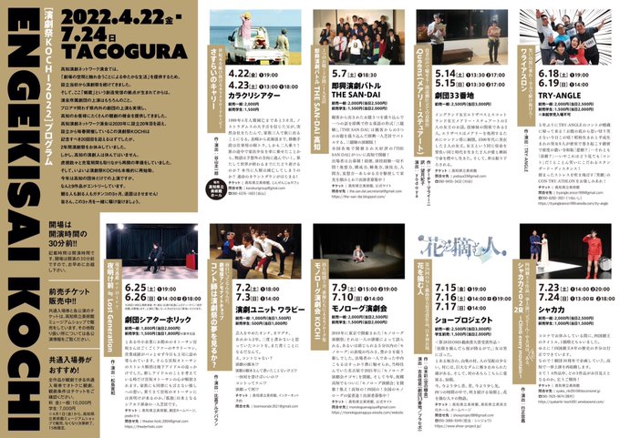 🌸演劇祭KOCHI、3年振りに開催されます!4/22(金)カラクリシアターを皮切りに、多彩な劇団の作品が見放題な3か月!我々シャカ力はトリを飾る7/23(土)・24(日)!お得な共通入場券は4/1(金)より高知県立美術館ミュージアムショップで発売!ぜひお買い求めください!詳しくは⇒https://t.co/sRzGMzuMnf