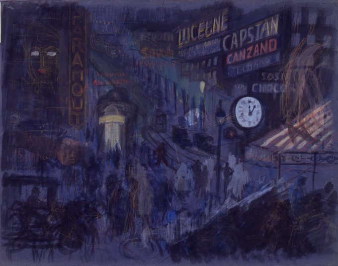 【山脇展、好評開催中!】GWの合間の平日ですが、当館は会期中無休です。欧州に留学した山脇は《パリ 夜のまち》でネオンや街灯の光、街に繰り出す人々のシルエットを描き、眠らない華の都の夜の雰囲気を捉えています。