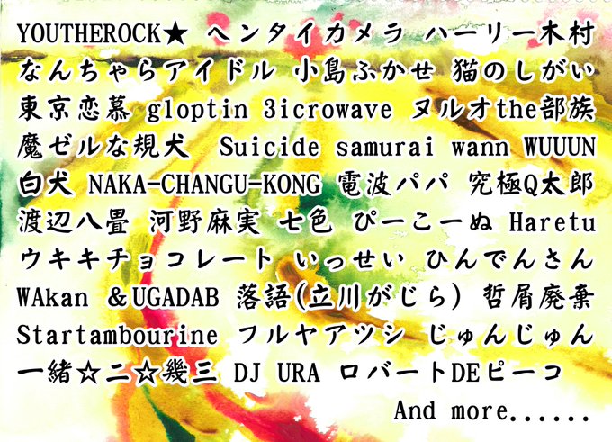 小島ふかせとかなんちゃらアイドルとかハーリー木村さんとかYOUTHEROCK★さんとかヘンタイカメラとか猫のしがいとか東京恋慕や3microwaveちゃんや魔ゼルな規犬とかが出演するぞ!!12時間イベント!!!