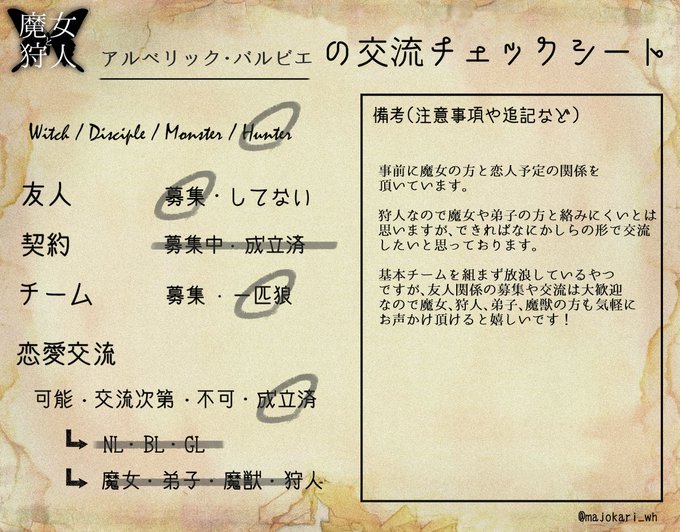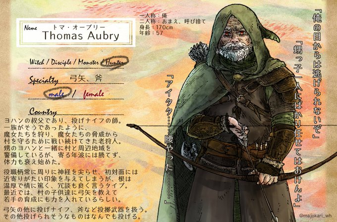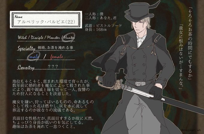 @majokari_wh もう少し狩りについても書きたかったので、キャラシ上げ直します…いいねリツイートくださった方すみません! 仲良し、歳近い狩人さんにはタメ語です。一人目との兼ね合いで交流頻度はまだ分かりませんが、宜しくお願いします(*´-`) #魔女と狩人 #魔女と狩人_CS #魔女と狩人_狩人