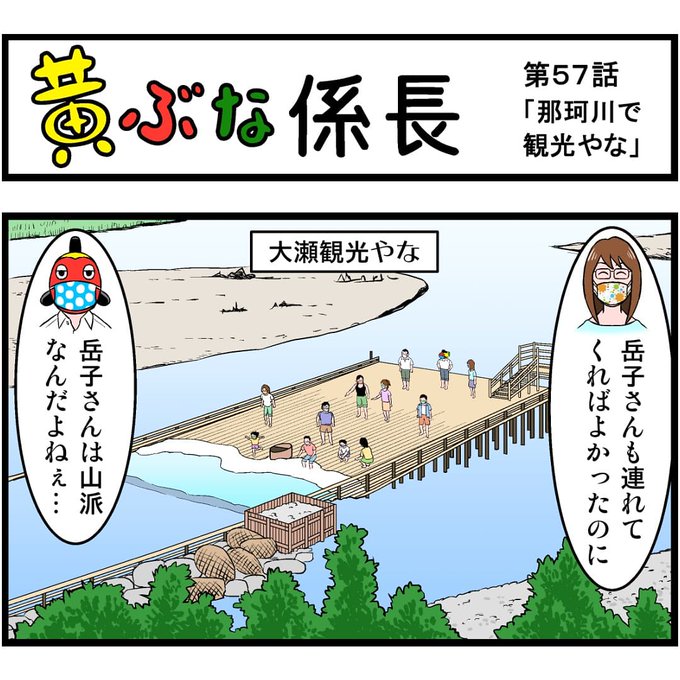 『黄ぶな係長』第57話「那珂川で観光やな」。 那珂川は天然鮎の遡上日本一! #黄ぶな係長 #黄ぶな #黄ぶな運動 #4コマ漫画 #漫画 #栃木県 #宇都宮市 #那珂川 #大瀬観光やな #やな #観光やな #鮎 #天然鮎