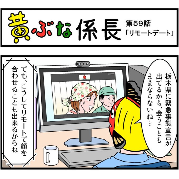 『黄ぶな係長』第59話「リモートデート」。 岳子さんの実家は生産数日本一のあの農作物を! #黄ぶな係長 #黄ぶな #黄ぶな運動 #4コマ #4コマ漫画 #漫画 #栃木県 #宇都宮市 #壬生町 #かんぴょう #干瓢 #かんぴょうレシピ