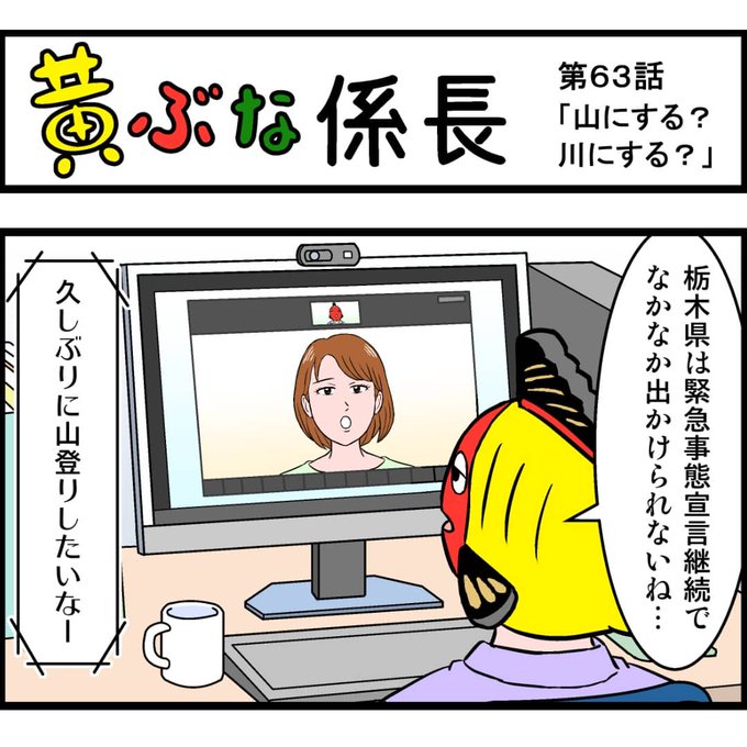 『黄ぶな係長』第63話「山にする?川にする?」。 趣味の違いは歴然です・・・。 #黄ぶな係長 #黄ぶな #黄ぶな運動 #4コマ #4コマ漫画 #漫画 #栃木県 #宇都宮市 #太平山 #行道山 #鞍掛山 #古峰ケ原高原 #大芦川 #登山