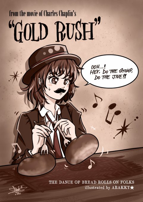 チャップリンの1925年のサイレント映画「黄金狂時代(The Gold Rush)」の中の、フォークを刺したパンを足に見立ててダンスをするかわいらしく楽しいシーンをオマージュ。