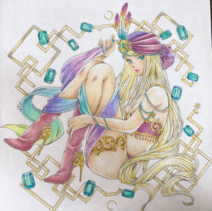 アンバランスな配色での背景色に閃いたので最後まで塗りました。羽はやはり輪郭取りながらしっかり塗る方が良さげ。肌の練習もせねば。