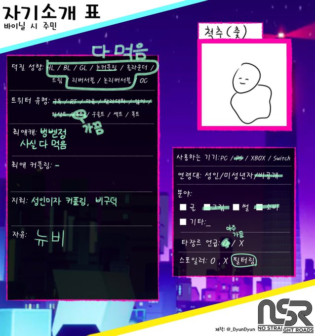 안녕하세요!! 방금 막 계정 판 뉴비입니다! 낙서와 썰 위주로 계정 굴러갈 것 같고 자세한 건 자기소개 표 참고해주세요! 흔적만 남겨주시면 바로 찾아갑니다!