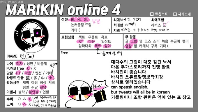 #Mo4_트친소 #마리킨온라인_트친소 #마온_트친소 타장르 언급 개많아요.. 겜플은 요즘 못하고 있고...짜피 광질도 제대로 못해서 다시 리제로부터 시작할려 하는 사람입니다.. 초짜에요.!.캐붕 심합네다.. 잘부탁드려효오.. 컾링은..주는대로 편식 안하고 꼭꼭 낼름낼름 챱챱 해요..