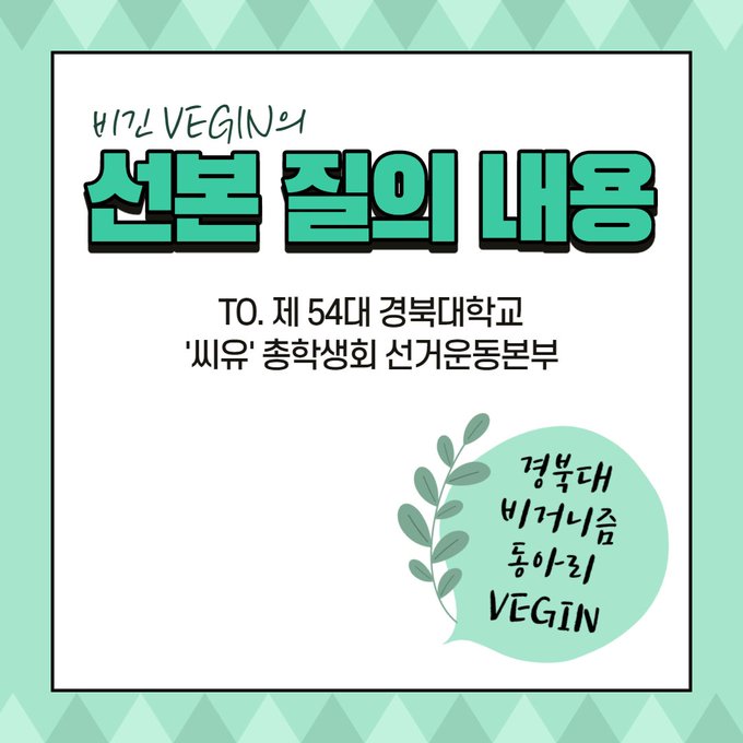 학교 안 비거니즘 실천과 식단의 다양성, 환경 보호 촉구를 위해 비긴에서 선거관리본부에 질문합니다.