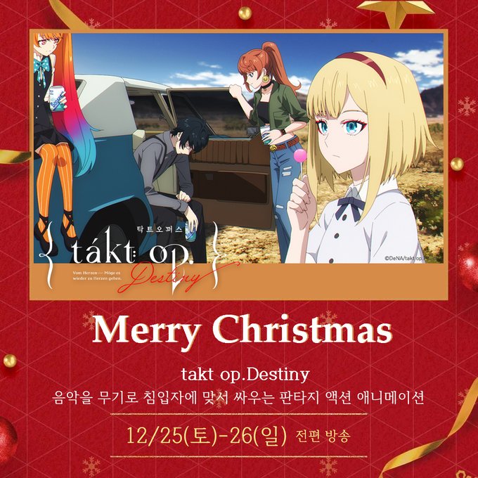 【#애니플러스】 크리스마스 특별편성 안내 🌟 🎄 방영일자 : 12.24 (금) ~ 12.26 (일) ✊ 도쿄 리벤저스 🎩 사신 도련님과 검은 메이드 💖 호리미야 🎼 takt op.Destiny ※ 자세한 일정은 TV 편성표를 통해 참고 부탁 드립니다. #도쿄리벤저스 #사신도련님 #호리미야 #takt