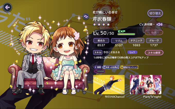 4☆ [네가 곁에 있는 행복] 세리자와 하루키 (CV:스즈무라 켄이치) 스킬 : [오늘이야말로 전하는] 14초마다 30%의 확률로 6초간 스코어가 7% 증가 장면 카드 : 지금만의 Chance 진화 장면 카드 : Party"k"night! #도쿄윈터세션 #세리자와하루키 #아이다미오