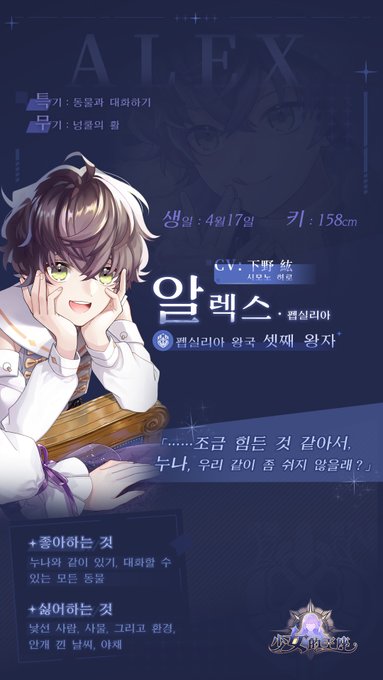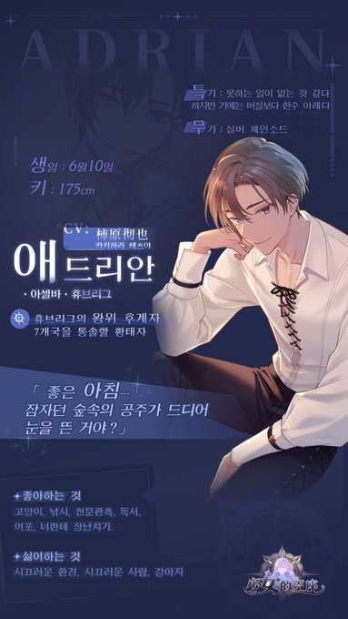“별을 볼 때마다 너도 곁에 있으면 좋을 텐데, 그래줄 수 있겠어? ... 장난이야, 신경쓰지 마." 늘 당신에게 장난치기 좋아하는 고양이 소년 - 애드리안. 밝은 미소에 가려진 슬픔이 담긴 그의 눈동자는 언제야 빛을 되찾을 수 있을까요? #소녀의왕좌 #少女的王座
