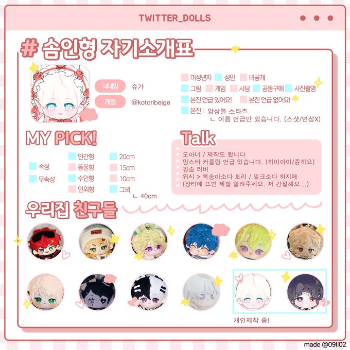#솜인형_트친소 #솜뭉치_트친소 여기도 많이 올 것 같아서 열어봐요! 개인제작, 자캐속성, 좋아하는 게임 속성, 무속성 인형...하여튼 이것저것 파는 네이비라고 합니다! 요즘에는 인장에 있는 핑크 아이에 꽂혀 있어요>< 성인 여성입니다. 잘 부탁 드려요><!