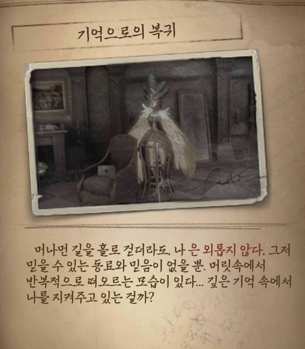 항상 공지 마지막에 이런 문장이 있던데 나이팅게일 양이 오르페우스를 수호하는 인격이라는 가설과 소설가가 앨리스를 나이팅게일이라고 칭하는 걸 보면 오르페우스가 악몽에서 벗어나는 방법은 과거의 행복한 기억에서 힘을 얻고 '뒤돌아보지 않으며' 진정한 자신을 되찾아야 한다는 걸까?