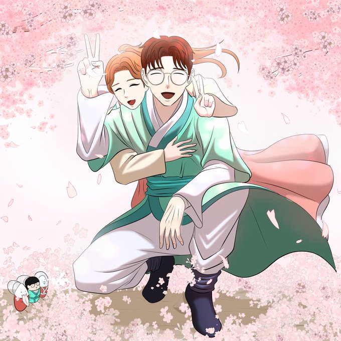 #콕카인_콕스님_2주년_합작 봄이라 벚꽃 + 콕스님 올해 결혼하시니 다영님과 함께 한복 입으신 모습을 그려봤습니다. (벚꽃이 너무 많은건 ㅎ) 2주년 축하드려요 콕스님!!