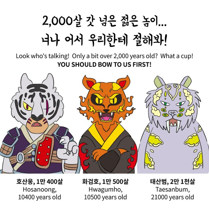 묘시월드의 호랑이 요괴들이 임인년 설날을 맞아 세배를 올립니다. 세뱃돈을 주겠다고 큰소리치는 육발이, 묘시월드에서 가장 어린 호랑이들인 호서방과 호소녀, 그리고 이런 육발이를 보며 가소로워하는 묘시월드의 어르신 호랑이 요괴들 ㅎㅎ 묘시월드에서는 1,000살쯤은 평균나이랍니다!