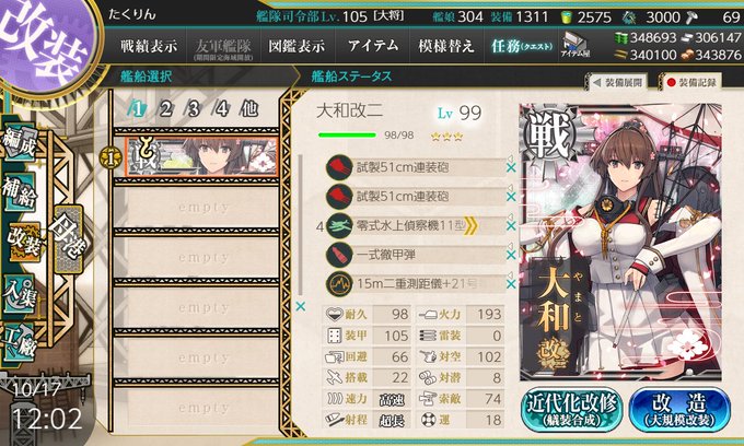 久々に警備府の提督執務室へ出勤、秋仕様に模様替え。そして必要な資材も全て集まったので大和の改ニ化完了!。5スロ装備は仮で画像4枚目な感じにしてますが更に最適化出来そう・・・。先日まで開催していたイベント海域の戦果が今一つだったので、これを機に反転攻勢掛けたい所。#艦これ