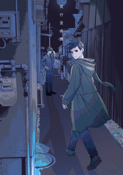 夜行堂奇譚の2巻発売✨おめでとうございます。136さんの朗読で「黒い薄手のシャツを羽織った細身の身体」って聞いたときに真っ先に思い浮かんだ図。(シャツ羽織ってるってことはこれとは違うかもしれんが)千早くんのイメージがまた更新されてしまった😊