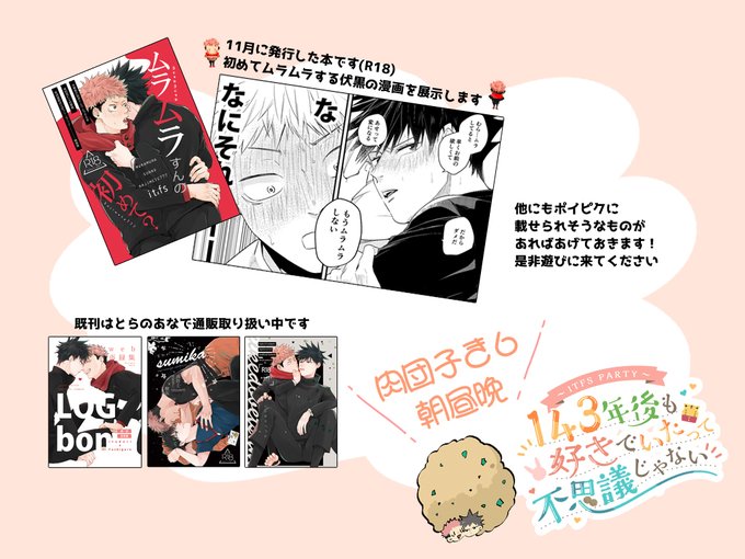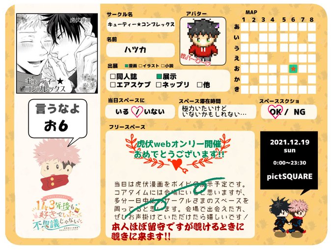 お品書きできた~!イベント楽しみすぎる🥳 再録は1~2週間ほど展示してますので、お時間のあるときに見てやってくれるとうれしいです!はじめて描いた虎♡伏だよ~