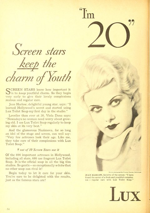 Many of Duncan’s portraits of Harlow appeared alongside magazine advertisements throughout 1931 and 1932, notably for Lux Toilet Soap. From MOVIE CLASSIC, August 1932: