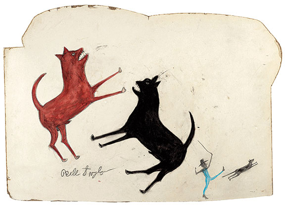 Signed work by Bill Traylor (1853/54-1949), "Two Dogs Fighting: Man Chasing Dog," 1939-42, tempera, graphite, & colored pencil on white paper-faced card, 18" x 25¾", sold for $293,750 at @ChristiesInc https://t.co/gpB3hNxOyi #antiques #antique #Outsiderart #Traylor #Americana