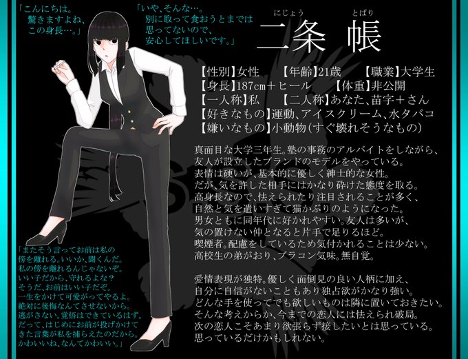 時系列的にはキョウト期間中あるいはその後に主人として登録されたアラサーOL主人です。基本的には明るく元気でおしゃべりな女性です。