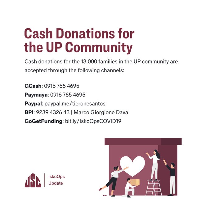IskoOps continue to seek cash and in-kind donations for the UP community. For cash donations: