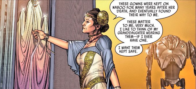 I'm crying for several reasons here firstly, Leia is wearing the same hairstyle like her mother. Leia has Padmé's beautiful lake dress that she wore when she had her first kiss w Anakin, & Leia wants a granddaughter to wear Padmé's beautiful dresses & she wants them kept safe😭💕