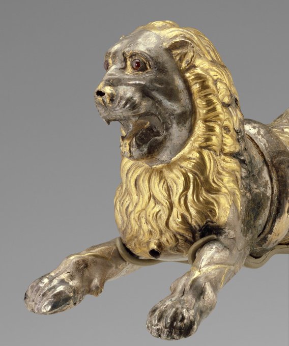 Produced c. 1st century BCE, it takes the form of a roaring lion leaping from the silver rhyton. It is decorated with a gold mane and inlaid garnet eyes.