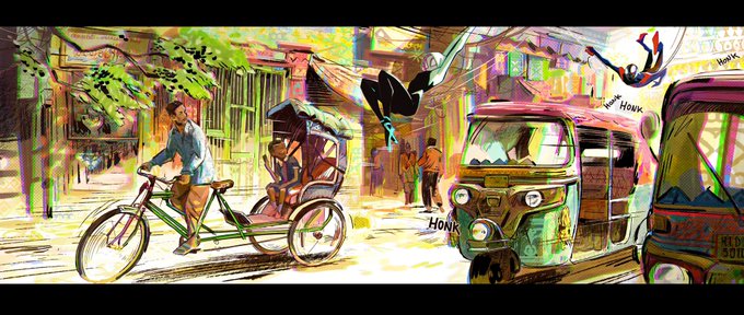 Miles, Gwen and Pavitr swinging in Mumbattan. Piece I made exploring the style of Spider-man India’s world. This image was important for me as it was able to set some foundations of what this world would become.