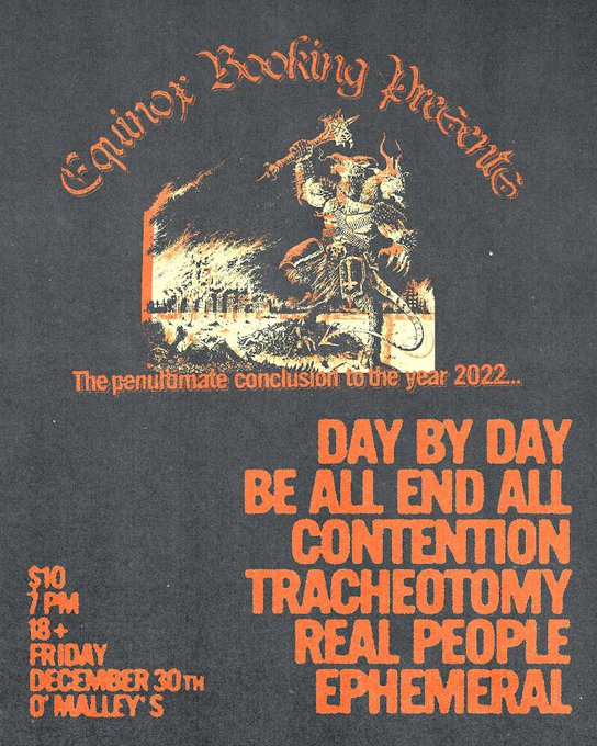 Finally booking DAY BY DAY again after over a year in south florida with BE ALL END ALL, Contention, @tracheotomymp3, Real People, & Ephemeral.