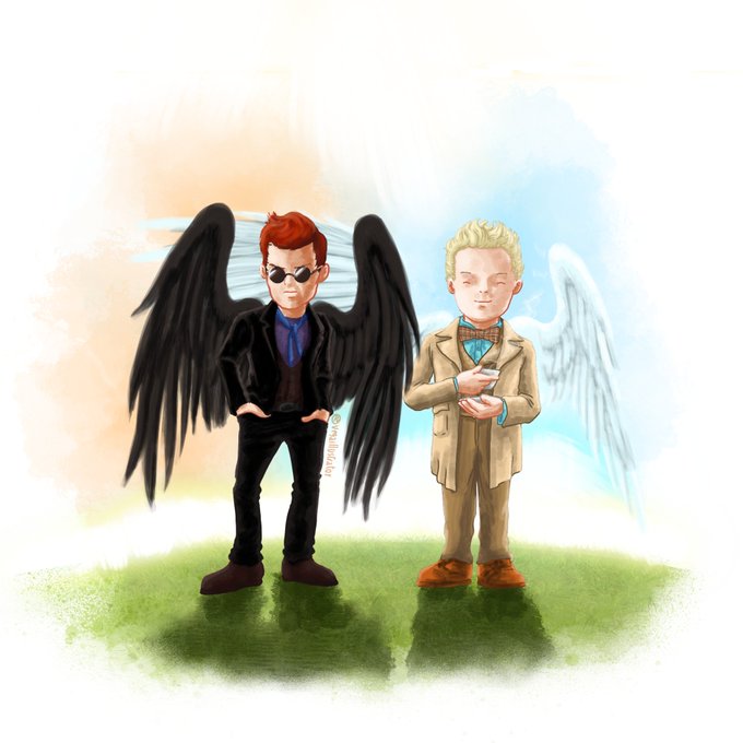 Sorprendido de buena manera por el anuncio de una segunda temporada de @GoodOmensPrime , lo cual me hizo re visitar un dibujito viejo que hice cuando estreno la primera, pero les guste!