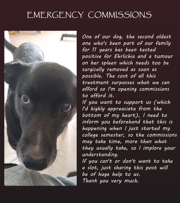 Our dog is currently going under a delicate and expensive treatment (more info below), so I'm in need of opening commissions to afford it.