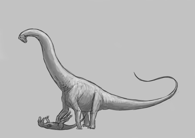 It's my first #FossilFriday on https://t.co/Fke6j4ZuQF, so it's time to post some sauropodomorph #paleoart! Here's Giraffatitan at the beach (2021), my Diplodocus mural for the Dorset Dippy exhibit (2019), Plateosaurus with flies (2020) and Shingopana with termites (2017).